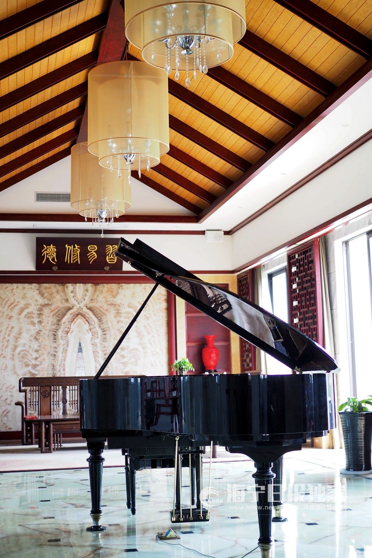 沿著樓梯向上,一架鋼琴優(yōu)雅地被擺放在二樓大廳中央,這里布置成新中式的風(fēng)格,使用了大量的木質(zhì)裝飾。二樓有可用于公司招待、部門聚餐使用的包間,有可以來此喝上一杯的酒水吧臺,推開陽臺門,即是日日西流,日日東趨海的錢塘江。